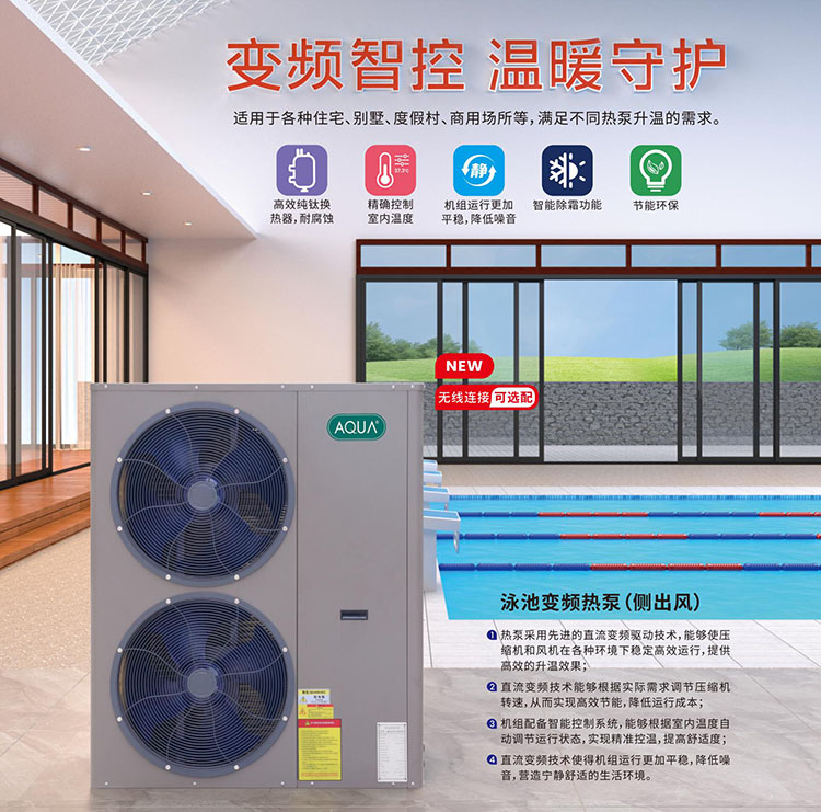 AQUA小黄片网址小黄片破解版变频热泵(侧出风款)在制热效率、能耗和噪音方面表现更优,并且结构设计相对简单,维护起来更加方便,比较适合空间有限的家用小黄片破解版或小型商业场所。它能以更快的制热速度,更低的加热成本,更静音智能的模式,为您开启恒温畅游新体验。