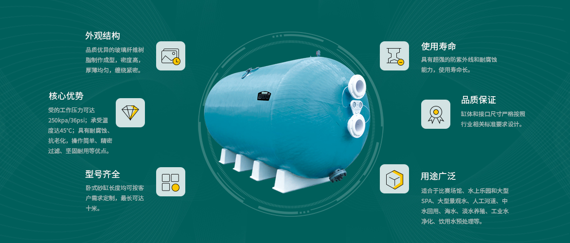 AQUA小黄片网址小黄片破解版设备旗下的卧式过滤砂缸缸体和接口尺寸严格按照行业相关标准要求设计,严格把控生产环节