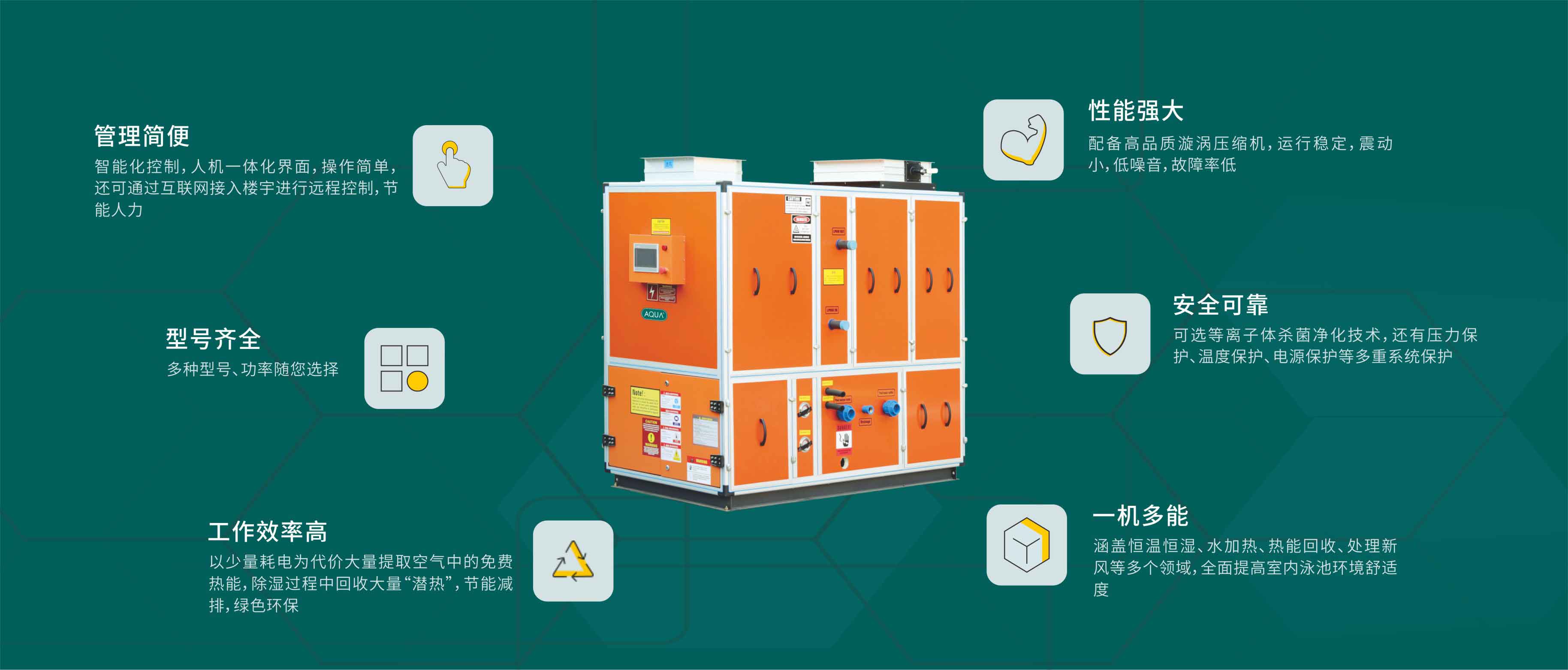 AQUA小黄片网址小黄片破解版设备旗下的除湿热泵系列集空调、除湿和池水加热于一体,大量回收并综合利用能量,克服高湿、高氯环境等诸多问题,通过春夏秋冬季节运行模式的改变,达到高效率、节能环保的运行,是一种十分环保节能的小黄片破解版设备产品。
