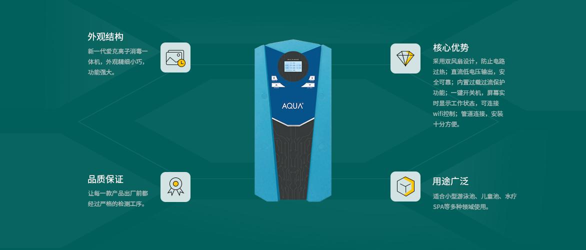 外观时尚;立体式设计,占地面积小,节省空间,安装简易,AQUA小黄片网址小黄片破解版消毒设备是游小黄片破解版、景观池、海洋馆、净水处理、水产养殖、废水处理、车间消毒等项目的理想选择。
